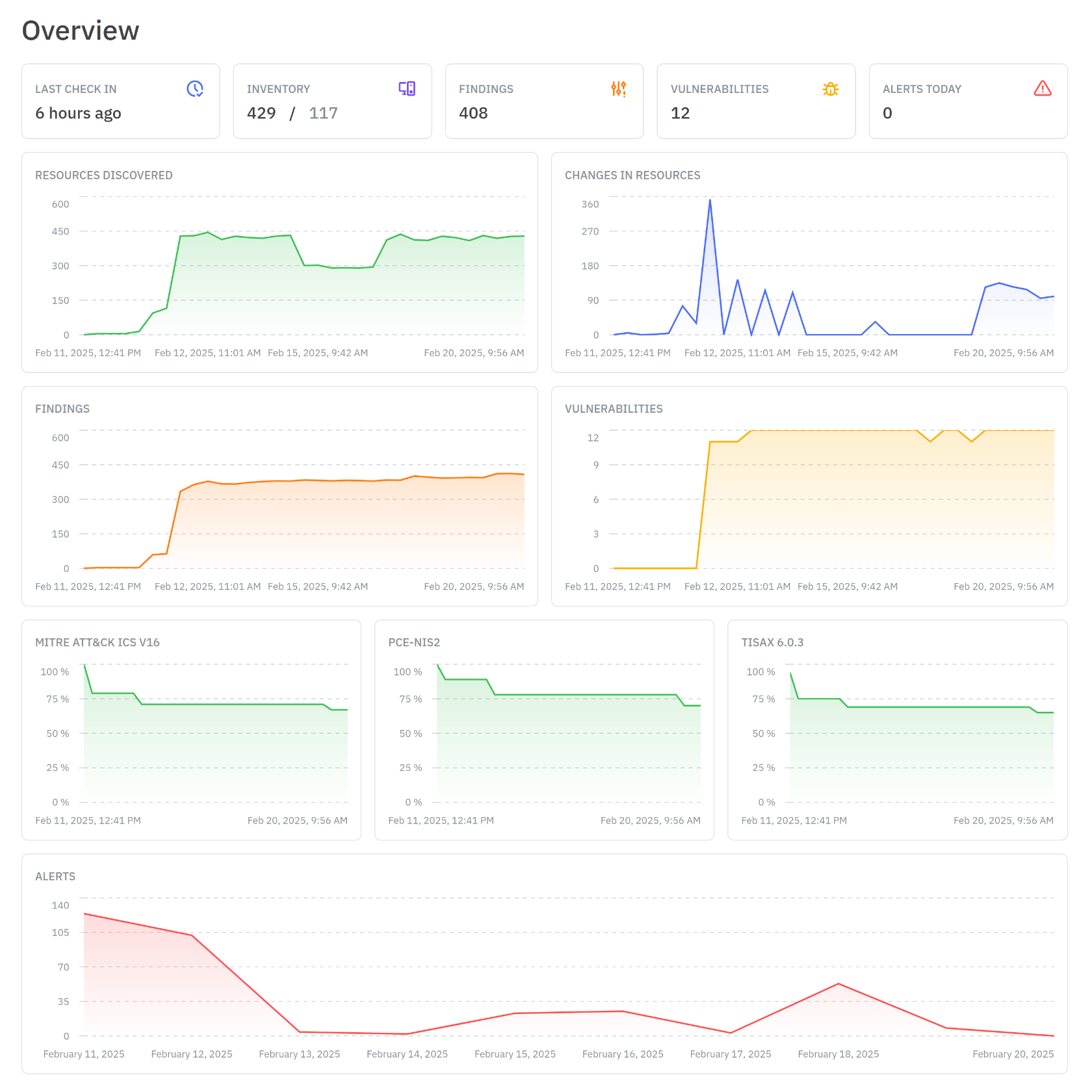 The Overview Dashboard provides a comprehensive view of your facility over the last 30 days, allowing for better trend analysis and early detection of security issues. By tracking historical data, you can identify changes in resource inventory, monitor vulnerabilities and findings over time, and ensure compliance with evolving security standards.