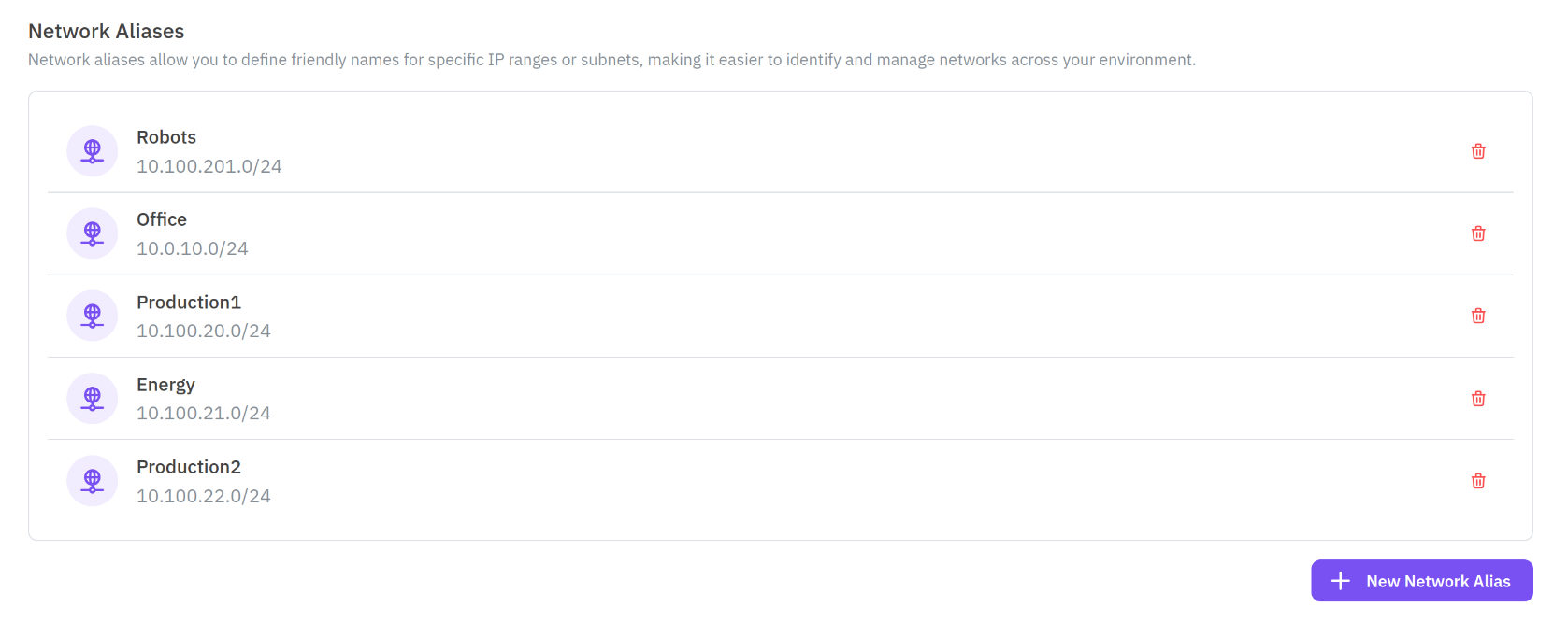 You can create new aliases or delete existing ones as needed. Any changes made to network aliases will take effect in the next snapshot, ensuring accurate and up-to-date mapping.