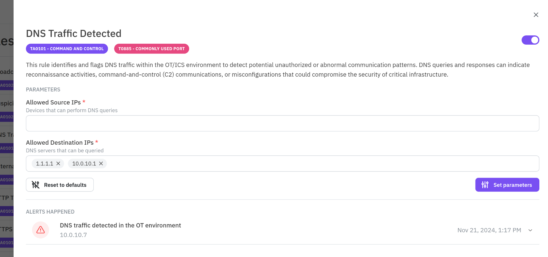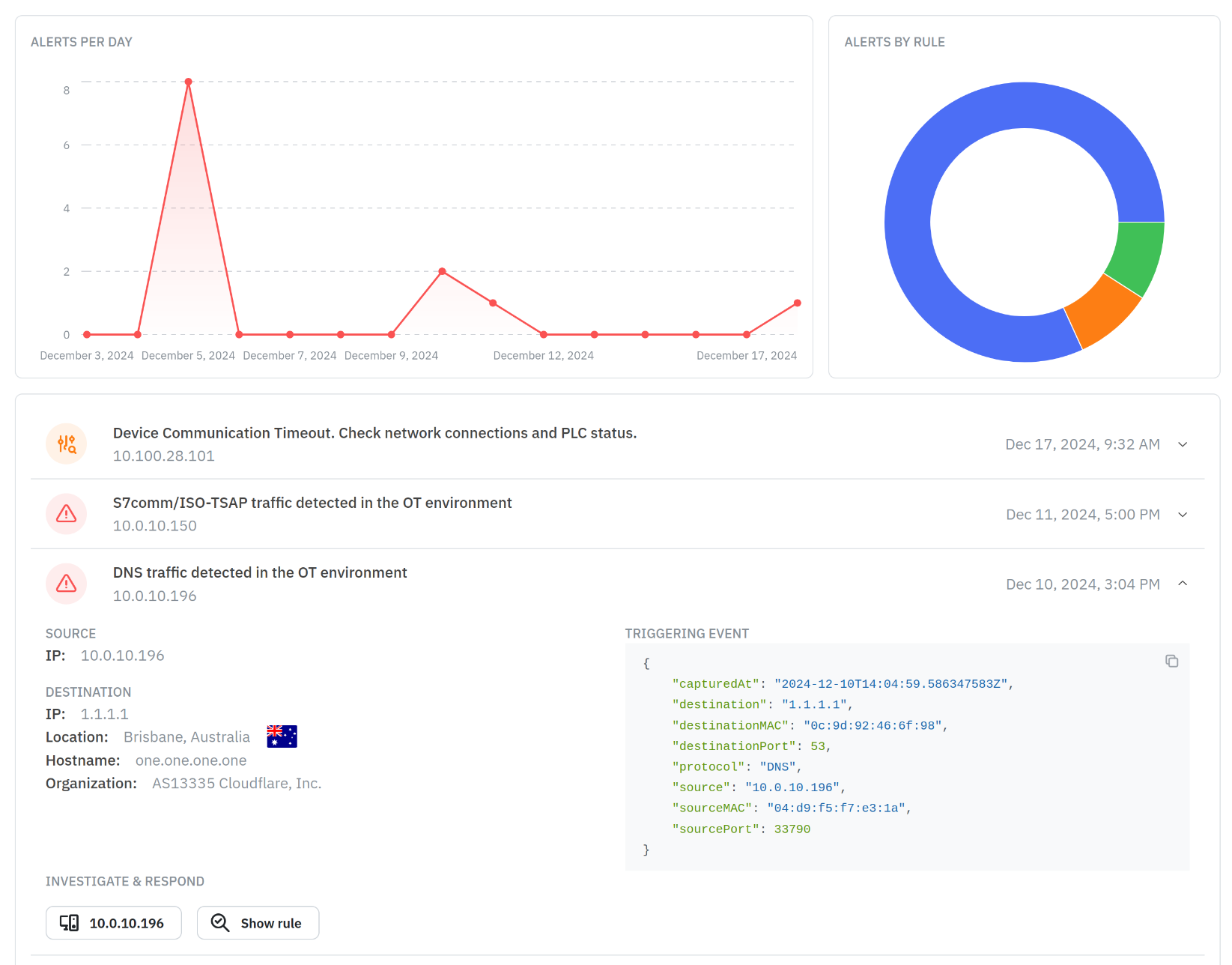 The Threat Detection module is divided into two key components: Alerts and Rules, providing comprehensive visibility and control over potential threats in your industrial environment.